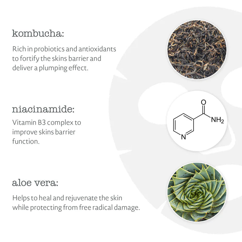 Kombucha Sheet Mask (3 masks) – an intensely hydrating bio-cellulose mask infused with Kombucha, Niacinamide, and Hyaluronic Acid to plump, refresh, and restore post-party skin.